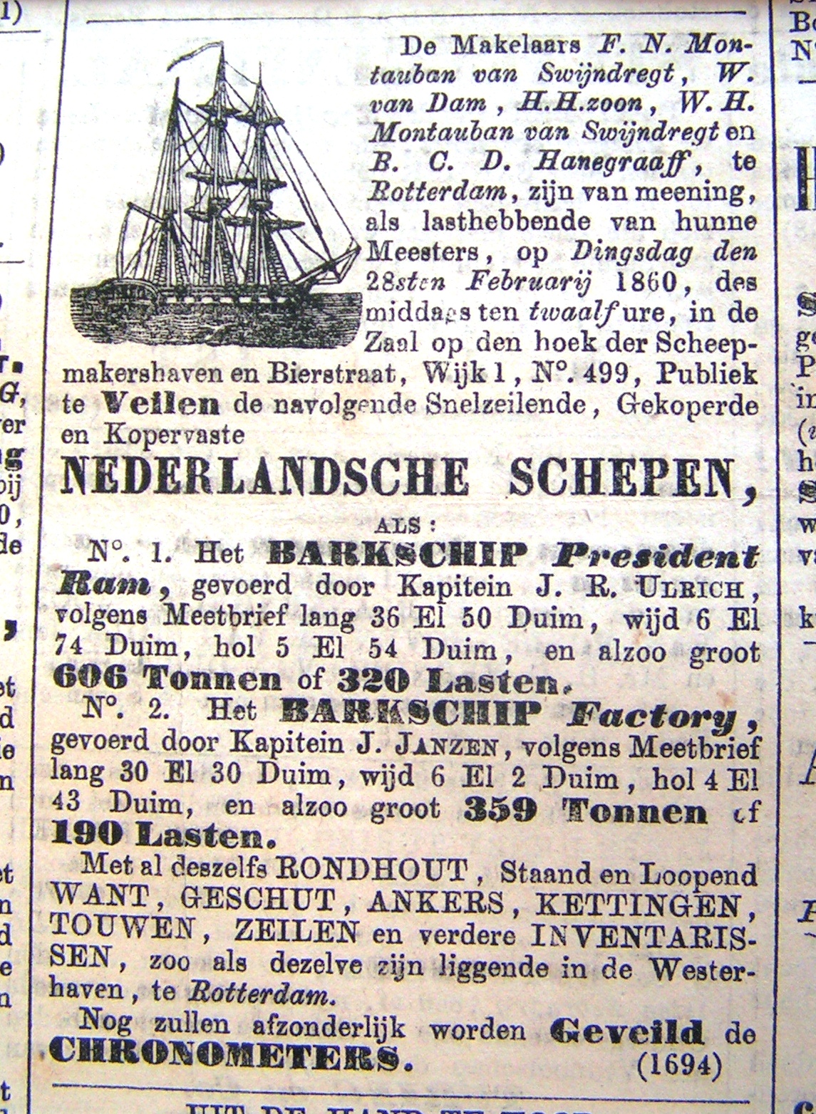 Te Batavia zijn aangekomen: De 27e maart het Nederlandse schip PRINS VAN ORANJE, kapt. P. de Boer, met zes passagiers, de 4e maart vertrokken van Passaroean; de 28e maart dito schip AURORA kapt. J.A. de Haas, met zeven passagiers, de 5e maart vertrokken van Soerabaija; de 29e maart dito bark NEDERLANDER, kapt. J. Lloyd, met Zr.Ms. troepen, van een verloren reis naar Padang (opm: dit betekent wellicht terug te Batavia met schade) Van Batavia zijn vertrokken: De 28e maart het Nederlandse schip HELENA CHRISTINA, kapt. B.J. Martens, met 18 passagiers, naar Rotterdam; dito schip OEY SINJO, kapt. Oey Jiet, naar Pekalongan, en de civiele (opm: gouvernements) schoener ZEEMEEUW, commandant SD.J. Swart, koers stellende om de oost. De 29e maart een buitenlands schip. De 30e maart de Nederlandse brik TARTAR, kapt. P. Rough, met Zr.Ms. troepen naar Sinkapoera; dito brik ALLEN, kapt. F.J. Harms, naar Pontianak; dito schoener CALYPSO, kapt. J. Stokhekker, met enige passagiers, naar Padang. Ter rede van Batavia liggende schepen: Zr.Ms. fregat PALEMBANG, Zr.Ms. schoener ARGO en de koopvaardijschepen PRINS VAN ORANJE, PERLE, MINERVA, OEMAR OSMAN, PLEIADES, de barken KALIEMAAS en NEDERLANDER, de brikken DANKBAARHEID en LA LUCILE, de schoeners BERTHA WILHELMINA en GOANHIEN, en vier buitenlandse vaartuigen. Het mede alhier ter rede liggende schip VROUW HELENA is hernaamd ATIJE FORACHMAN, en het dito schip JADUL BARIE is wederom hernaamd in BARON VAN DER CAPELLEN. Te Samarang zijn aangekomen: De 21e maart het Nederlandse schip de GEZUSTERS, kapt. J.C. Schmidt, met enige passagiers en Zr.Ms. troepen, de 1e maart vertrokken van Soerabaija; dito stoomboot VAN DER CAPELLEN, kapt. W. Muhldorff, met enige passagiers, de 19e dito vertrokken van Batavia; de 22e maart de dito brik De SNOEK, kapt. Tjoempong, de 14e dito vertrokken van Batavia; dito schip DORTENAAR, kapt. H.P. Visser, de 15e dito vertrokken van Soerabaija; de 23e maart dito bark BOEROONG, kapt. McIver, met Zr.Ms. troepen, de 14e dito vertrokken van Batavia; de 24e maart dito civiele schoener CALYPSO, commandant J. Corbet, van Cheribon, de dito schoener AMELIA, kapt. Dudman, de 22e dito van Batavia en twee buitenlandse vaartuigen; de 25e maart dito schip HOK-HAY, kapt. Ralph, met een passagier, van Batavia en Cheribon de 21e dito vertrokken. Van Samarang zijn vertrokken: De 21e maart het Nederlandse schip PEKALONGANG, kapt. Tan Inhok, naar Batavia; de 23e maart dito bark CHARLES, kapt. J. Zoccola, met drie passagiers naar Batavia; de 24e maart dito stoomboot VAN DER CAPELLEN, kapt. W. Muhldorff, met Zr.Ms. troepen naar Batavia, en dito schip GEZUSTERS, kapt. J.C. Schmidt, met een passagier en Zr.Ms. troepen naar Batavia; de 25e maart de civiele schoener CALYPSO, commandant J. Corbet, naar Soerabaija, en dito schoener AMELIA, kapt. W,H, Dudman, met een passagier naar Batavia; de 26e maart dito bark BOEROONG, kapt. McIver, naar Banjermassing, en dito schip VRIENDSCHAP, kapt. D.G. Doeksen, met twee passagiers, over Batavia naar Rotterdam. Te Soerabaija zijn aangekomen: De 19e maart: de Nederlandse schoener DOLPHIJN, kapt. Sengo Semodro, met een passagier, de 13e maart vertrokken van Sumanap; de 23e maart Zr.Ms. fregat DIANA, ccommandant kapt.t.zee J.C. Koopman; de 24e maart: het Nederlandse schip ONDERNEMING, kapt. J.P. Middel, de 20e maart vertrokken van Passaroeang; dito schip ESPERANCE,a kapt. J. Worthington, de 8e dito vertrokken van Batavia, en een buitenlands schip; de 25e maart de Nederlandse brik ONG INGTJOAN, kapt. Ong Liauw, de 13e maart vertrokken van Samarang, en de dito brik POLLUX, kapt. W.E. Looker, van een verloren reis. Van Soerabaija zijn vertrokken: De 20e maart de Nederlandse bark ALEXANDER, kapt. F.S. Harris, met een passagier, naar Makasser en Amboina, en de civiele schoener HAGEDIS, commandant Wobben, koers stellende om de oost; de 21e maart een buitenlandse brik, het Nederlandse schip LOUISA PRINSES DER NEDERLANDEN, kapt. J. Keijzer, met vijf passagiers naar Dordrecht; en het dito schip LOUIZA, kapt. H.J. Poortenaar, met Zr.Ms. troepen naar Makasser en Amboina; de 22e maart de Nederlandse bark POLLUX, kapt. W.E. Looker, naar Batavia, dito schoener DOLPHIJN, kapt. J. Zeep, met Zr.Ms. troepen naar Pontianak; dito schip GRACE, kapt. J.F. Grum, met zeven passagiers naar Samarang, Indramaijoe en Batavia; de 24e maart de Nederlandse (opm: N.O.I.) brik DOROTHEA, kapt. C. Boyle, met een passagier, over Batavia naar Benkoelen; dito schip ORTELIUS, kapt. D.G. Niesen, over Passaroeang en Samarang naar Batavia en dito schip FACTORIJ, kapt. J. Parlevliet, over Samarang naar Nederland. Ter rede van Soerabaija liggende schepen: Zr.Ms. fregat DIANA, Zr.Ms. korvet ZWALUW, Zr.Ms. schoener PILADES, en Zr.Ms. kanonneerboten No.8, No. 9 en No. 15, en de Nederlandse koopvaardijschepen JULIA, JOHANNA FREDERIKA, MADORA, EUGENIE, HENRIETTE EN HENRY, THETIS, VEREENIGING, ONDERNEMING, ESPERANCE, MARGARETHA CATHARINA, IDA ALIJDA, de barken VILLA, CAROLINA EN JACOBA, BERKAT, BLORA, RADJA WALIE, ELEONORA, FATAL JAWAD en POLLUX, de brikken JAVA, OLIE OESOOR, VAN SPEIJK, TEKSING, TWEE GEZUSTERES, PRINS FREDERIK, de schoeners DOLPHIJN en CAROLINA en vier buitenlandse schepen.