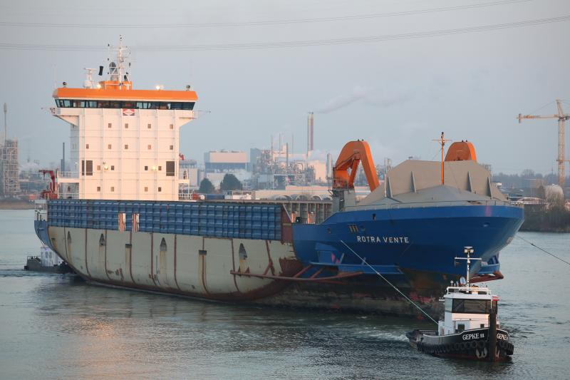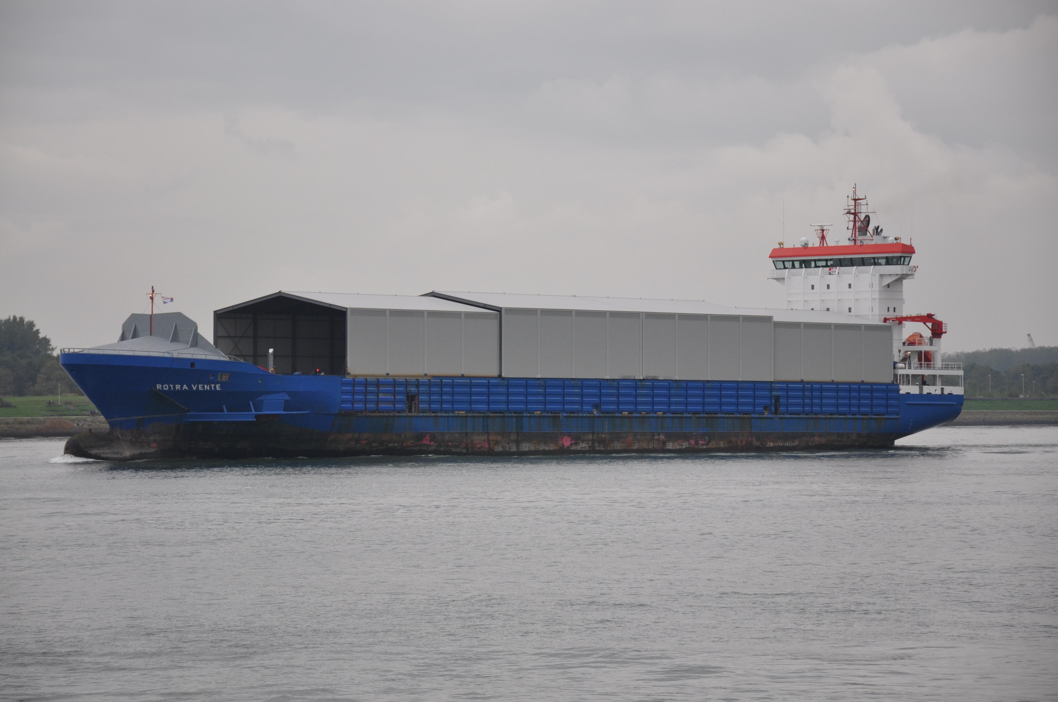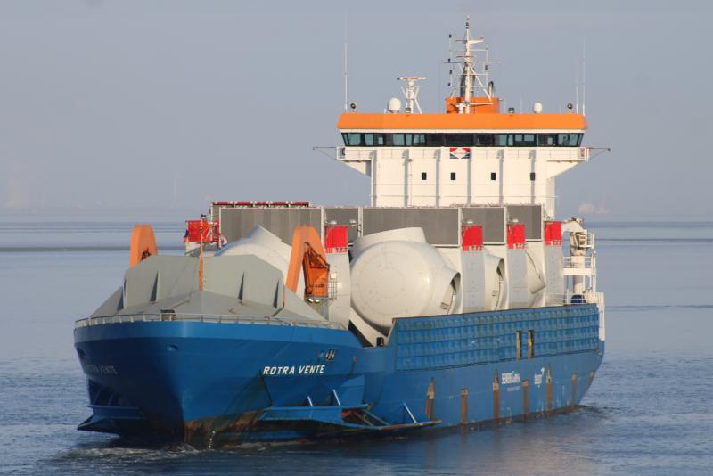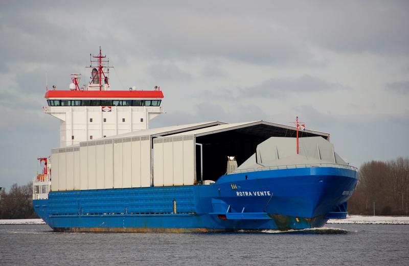 De Rotra Vente heeft een opklapbare boeg. Via een oprijbrug of ramp kunnen zo onder meer 350 tot 400 ton wegende behuizingen (nacelles) voor grote windturbines (6 tot 8 MW) worden geladen en gelost. Een onverkocht casco voor een containerfeeder diende als basis voor het nieuwe schip. Het werd in 2008 in China voor rekening van IHDA gebouwd, maar vond bij aankomst in 2010 geen koper. Voor de nieuwe toepassing is het casco ingrijpend verbouwd. Het opvallendst is de 70 ton wegende omhoog scharnierende boeg. Wanneer die volledig open staat is er een doorgang van 10,50 meter hoog over de volle breedte van het ruim. De zware-ladingstukken worden op speciale karren het schip in gereden. Het nieuwe versterkte ladingdek kan 17,5 ton per vierkante meter dragen en voor het zeevast sjorren van de karren met de 10 meter hoge nacelles zijn om de paar meter zware ogen in en op het dek gemaakt. Ballastsysteem. Een speciaal ballastsysteem voorkomt dat de boeg inzinkt wanneer een zwaar ladingstuk over de ramp het dek oprijdt. Het ballastsysteem houdt het schip zowel over de lengte- als over de breedte-as horizontaal. De ballasttanks bevinden zich onder het ladingdek en gedeeltelijk in de dubbelwandige zijwanden van het schip. Onder het dek loopt over de volle lengte van het ruim een metershoge schacht met leidingen, pompen en kleppen, met aan stuur- en bakboord daarvan de ballasttanks. Twee computergestuurde ballastpompen met een capaciteit van 1600 kuub en twee met een capaciteit van 580 kuub per uur zorgen dat ballastwater snel en accuraat wordt verplaatst. Op zee kan het ballastsysteem ook voor evenwicht zorgen wanneer het schip door wind of deining teveel op een oor komt te liggen. Overkapping. In totaal is voor de om- en afbouw zo'n 1000 ton aan nieuwe staalconstructies aangebracht. Er passen acht nacelles in het ruim. Om die tegen slecht weer te beschermen is een ruim 11 meter hoge overkapping aangebracht boven het ladingdek. De tot de coaming doorlopende overkapping sluit het dek niet waterdicht af, maar houdt wel veel tegen. Omdat het RoRoschip minder hard hoeft te varen dan een containerschip, is een lichtere en zuiniger voortstuwing geplaatst. De Rotra Vente heeft een achtcilinder Wärtsilä 38 hoofdmotor met een door Wärtsilä geleverde tandwielkast en verstelbare schroef. Daarmee haalt het een snelheid van 15 knopen. De dienstsnelheid is 12 knopen. In het voorschip staat een door Veth Propulsion geleverde boegschroef van 750 kW. Het Papendrechts bedrijf tekende ook voor de generatoren. Kapitein Peter Niejenhuis brengt het schip uit. Rotra Mare. In Werkendam wordt intussen gewerkt aan de afbouw van een zusterschip van de Rotra Vente, de Rotra Mare, die ook voor Siemens gaat varen. Voor de Rotra Mare is het casco van een zusterschip van het containercasco gebruikt dat wel werd afgebouwd en een aantal jaren als Flinter Coral voer. De Rotra Mare krijgt geen overkapping en zal vooral worden gebruikt voor het vervoer van 75 meter lange rotorbladen van de fabriek van Siemens in Hull naar het Deense Esbjerg. De schepen zullen ook de productielocaties van Siemens in Cuxhafen en Åbenrå aanlopen. De Concordia Group blijft eigenaar van de schepen, waarvoor een langlopend vervoerscontract is afgesloten met Siemens en haar logistieke partner Deugro. Het nieuwe vervoersconcept levert ten opzichte van het laden en lossen met kranen een transportkostenbesparing op van 15 tot 20%. (Bron: Schuttevaer.nl, 10-2016).