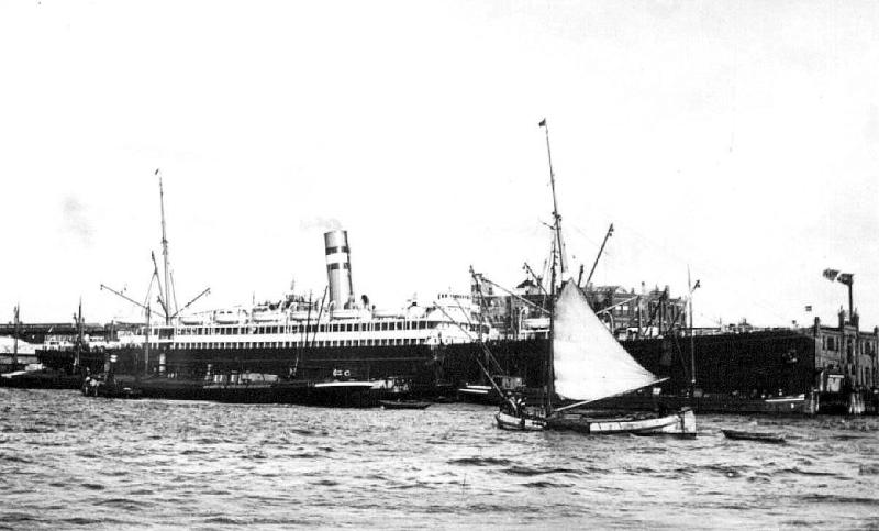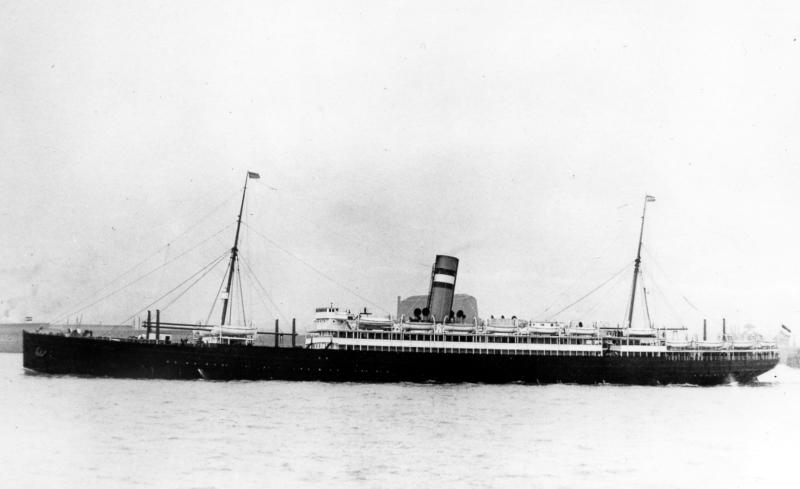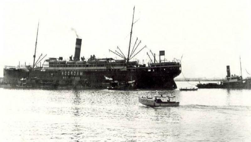 De NOORDAM, op een mijn gelopen en zwaar beschadigd. Het is nog niet bekend of dit het lopen op een mijn van 17 oktober 1914 of van 3 augustus 1917 is. |