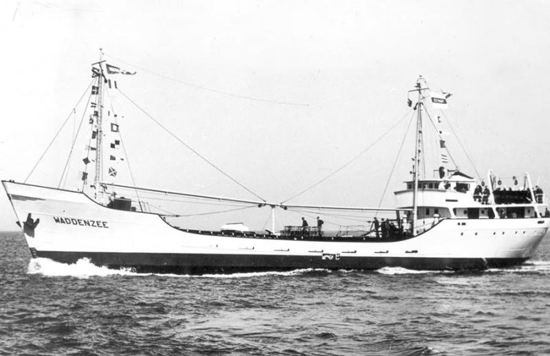 Leeuwarder courant 15-04-1959: „WADDENZEE" op proefvaart op zomerse Waddenzee. Gistermorgen „tegen koffietijd" werden op de Nieuwe Willemshaven te Harlingen de trossen losgemaakt van de nieuwste aanwinst van rederij Holwerda te Heerenveen, de 730 ton d.w. metende kustvaarder „Waddenzee". Met een groot aantal genodigden heeft het op de Waddenzee — hoe kan het ook anders-- een geslaagde proeftocht gemaakt. De zon en de weldadige warmte maakten het verblijf op het dek tot een waar genoegen De „Waddenzee" is de grootste tot dusver bij de scheepswerf „Harlingen" gebouwde kustvaarder. Het schip is 54.50 m lang, 8.50 m breed, terwijl de holte 3.50 m bedraagt. In de machinekamer staat een 525 pk MWM motor opgesteld, waarmede tijdens de proefvaart een snelheid van ca. 10 mijl werd bereikt. De „Waddenzee" is uitgerust met richtingzoeker, echolood en radio-telefonie. Commodore van de Holwerda-vloot is de heer Hein Holwerda.