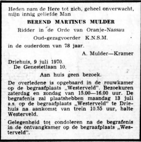 Berend Martinus overleed op 09.07.1970 te Driehuis (78). (Overlijdensadvertentie in De Telegraaf van 10-07-1970)