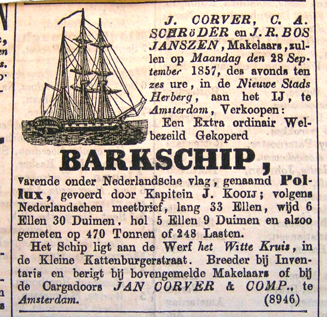 Te Batavia aangekomen schepen: De 25e september: Zr.Ms. schoener JANUS, luit.t.zee 1e klasse J.T. Daansen, van Soerabaija de 16e september; stoomschip KONINGIN DER NEDERLANDEN, kapt. C, Bornemann, van Samarang de 24e september met negen passagiers; fregat HENRIETTE CLASINA, kapt. F.J. Hoffman, van Amsterdam de 5e juni; fregat ERFPRINCES SOPHIA, kapt. H.K. Hellers, van Middelburg de 5e juni; fregat DILIGENCE, kapt. H. Bos, van Tagal de 15e september; fregat CHARLOTTA, kapt. P. Blair, van Patjitan de 20e september; bark MASTOOR, kapt. Sech Vadil bin Hydragt, van Cheribon de 12e september; brik TEKSIEN, kapt. Kate Abdul Rachman, van Indramaijoe de 22e september. De 27e september: schoener DE LEEUW, kapt. J.R. Rutter, van Helvoetsluis de 2e juni; bark DE HOOP VAN ALBLASSERDAM, kapt. A. Pronk, van Calcutta de 21e juli; bark MARIA ENGELLINA, kapt. W.F. Fontijn, van Pekalongan de 24e septembermet een passagier; fregat MERCURY, kapt. J. Schoon, van Banka de 10e september. De 28e september: de bark KONGSING, kapt. Lauw Tjoe, van Pekalongan de 19e september. Van Batavia vertrokken schepen: De 26e september: fregat KONINGIN DER NEDERLANDEN, kapt. F.A. Bangeman Sietzes, naar Soerabaija. De 27e september: fregat PRINS VAN ORANJE, kapt. P. de Boer, naar Soerabaija; fregat MAASSTROOM, kapt. C. van der Linden, naar Rotterdam; fregat JAVA, kapt. J.H. Zeeman, naar Rotterdam; brik EAGLE, kapt. J. Face, naar Borneo met een passagier. De 29e september: fregat NEERLANDS KONING, kapt. M. Schaap, naar Rotterdam; bark LOUISA, kapt. G. King, naar Soerabaija met een passagier en Zr.Ms. troepen; schoener GOLLAK, kapt. Singo Djoijo, naar Joana. Te Samarang aangekomen schepen: De 20e september: Zr.Ms. schoener JANUS, luit.t.zee 1e klasse J.T. Daansen, van Soerabaija; stoomschip KONINGIN DER NEDERLANDEN, kapt. C. Bornemann, van Batavia de 19e september, met passagiers en Zr.Ms. troepen; bark BERKAT (opm: moeilijk leesbaar), kapt. Adam, van Banjermassing de 5e september; bark FATHOOL RACHMAN, kapt. Oewa Rago, van Banjermassing de 5e september; bark JAN PIETERSZOON KOEN, kapt. P. van Duijvenboden, van Soerabaija de 18e september. De 22e september: bark BALHAER, kapt. Said Abdulla bin Hassan Segaf, van Sumanap de 19e september; bark AL MOCHLAIRE, kapt. Sech Mochamat bin Obit Baraowan, van Grissee de 19e september met passagiers; bark DE RHIJN, kapt. C. Brandligt, van Batavia de 15e september. De 24e september: bark HING GOAN, kapt. Lim Kwiho, van Tagal de 21e september. De 25e september: schoener ENGELLINA LOUISA, kapt. Pa Lanon, van Korowelang de 23e september. Van Samarang vertrokken schepen: De 19e september: brik ORESTES, kapt. C. Gordon, naar Soerabaija en Moluccos met passagiers. De 20e september: schoener ENGELLINA LOUISA, kapt. Pa Lanon, naar Karawelang; Zr.Ms. schoener JANUS, luit.t.zee 1e klasse J.T. Daansen, naar Batavia. De 21e september: fregat PALEMBANG, kapt. A. Orts, over Batavia naar Nederland. De 22e september: bark JAN PIETERSZOON KOEN, kapt. P. van Duijvenboden, naar Cheribon. De 24e september: bark AL MOCHLAIRE, kapt. Sech Mochamat bin Obit Baraowan, naar Batavia, Benkoelen en Padang met passagiers; bark FATAHOOL HAIR, kapt. Anakoda Laujin, naar Pontianak en Riouw; stoomschip KONINGIN DER NEDERLANDEN, kapt. C. Bornemann, naar Batavia met acht passagiers. Te Soerabaija aangekomen schepen: De 18e september: bark CAROLINA JACOBA, kapt. W.E. Looker, van Batavia de 9e september; Zr.Ms. schoener ZEPHYR, luit.t.zee 1e klasse P. Clijver, van Batavia de 4e september. De 19e september: schoener CORINGA, kapt. Kwee Goin, van Banjermassingde 9e september; bark FATAL KARIEM, kapt. Lim Boensang, van Amboina de 10e juli. De 22e september: brik UNION kapt. J.B. Berest, van Batavia de 26e augustus met een passagier; fregat WLTEVREDEN, kapt. K.H. Meijerhoff, van Batavia de 12e september;fregat het GOED VERTROUWEN, kapt. P.H. Lund, van Batavia de 11e september; brik ORESTES, kapt. C. Gordon, van Batavia de 8e september met passagiers. Van Soerabaija vertrokken schepen: De 19e september: bark FATAL BARIS, kapt. Sech Abdulla bin Mochamat Hassan, over Boender naar Palembang; schoener DOLPHIJN, kapt. Singo Samodro, naar Sumanap met als passagiers de Panambahan van Pamakassan en gevolg en twee Europese passagiers; schoener ZORG VRIJ, kapt. E. Janssen, naar Sumanap. De 20e september: fregat PIETER FLORIS, kapt.J.F. Spiegelberg, naar Passaroeang. De 21e september: bark DOROTHEA HENRIETTE, kapt. R.J. Theedensz, naar Makasser met passagiers en Zr.Ms. troepen; Zr.Ms. brik POSTILJON, luit.t.zee 1e klasse J. Schröder, koersstellende om de oost. De 22e september; schoener JOPIE, kapt. Oen Samboe, naar Balie. Te Cheribon aangekomen schepen: De 21e september: bark KONGSING, kapt. Lauw Tjoe, van Pekalongan de 19e september. De 24e september: bark JAN PIETERSZOON KOEN, kapt. P. van Duijvenboden, van Bezoeki en Samarang de 14e september; fregat FATHAR RACHMAN, kapt. Sech Sobit bin Abdul Rachman, van Batavia de 18e september. Van Cheribon vertrokken schepen: De 22e september: bark POLLUX, kapt. Ang Tjoenkiat, naar Tagal. De 25e september: de bark KONGSING, kapt. Sauw Tjoe, naar Batavia. De 26e september: fregat VROUW JEANETTE, kapt. Hong Tjiseng, naar Palembang en Riouw. Te Banjoewangie aangekomen schepen: De 18e september: bark POLLUX, kapt. C.G. Blankert, van Soerabaija de 7e september. Van Banjoewangie vertrokken schepen: Geen. Te Wijnkoopsbaai aangekomen schepen: De 24e september: fregat IDA WILHELMINA, kapt. D. Boelhouwer, van Batavia de 19e september. De 28e september: fregat WILLEM, kapt. Rijken, van Batavia de 24e september. Van Wijnkoopsbaai vertrokken schepen: Geen. (opm: de nationaliteit van alle schepen wordt duidelijk vermeld; buitenlandse schepen zijn derhalve weggelaten)