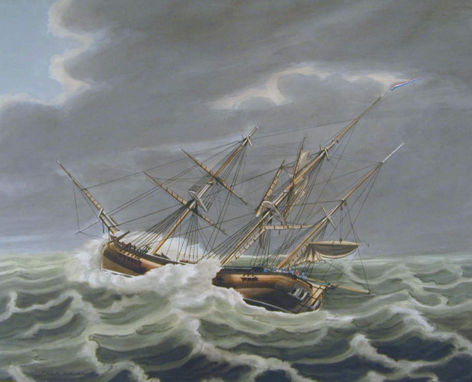 Volgens brief van kapt. Dietz, voerende het schip CONCORDIA, te Harwich binnen, heeft hij de 23e november 1836 het grote marszeil verloren en nog drie zeilen moeten kappen om het resterende te behouden. De ketting los rakende sloeg tegen de luiken, waardoor hij (opm: het schip) water binnen kreeg. De 30e november 1836 goed weer zijnde, besloot hij naar binnen te lopen, hetwelk hem echter niet gelukte en werd tot op 05º NB teruggestormd.