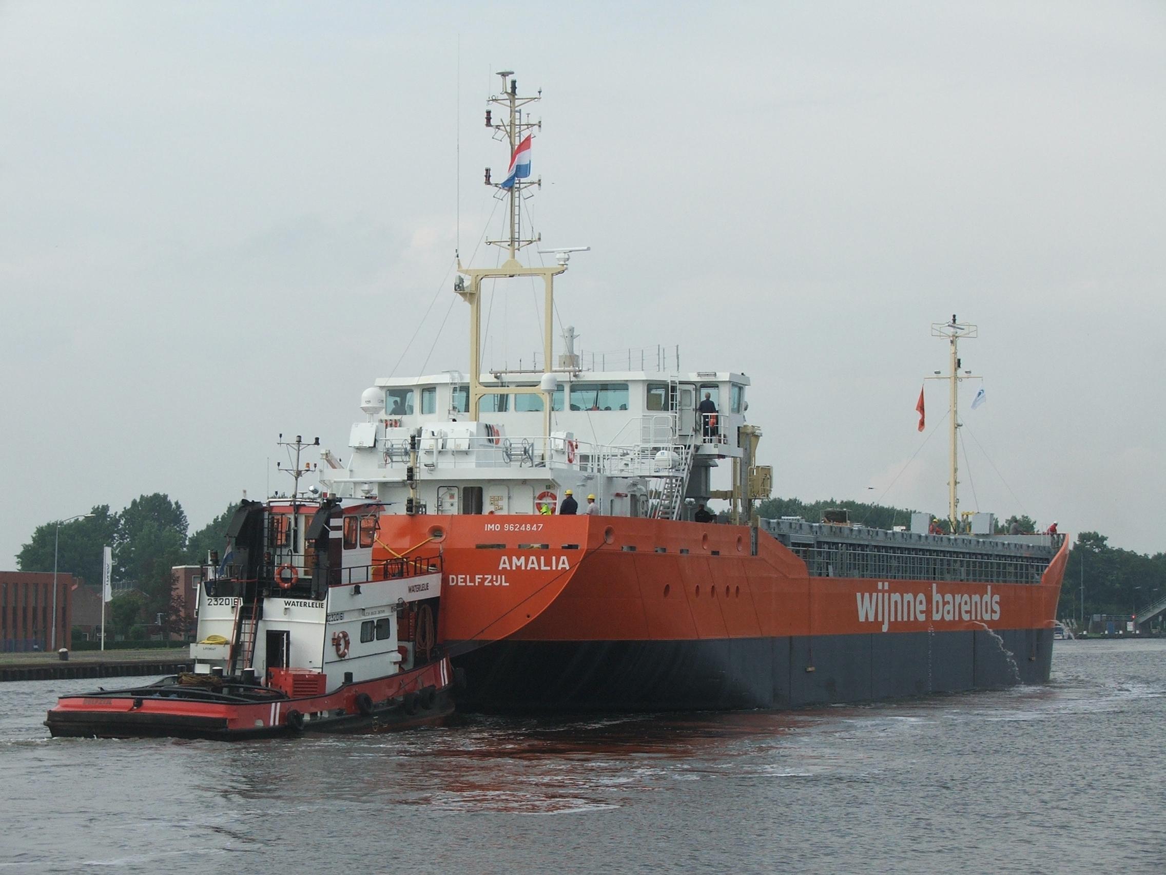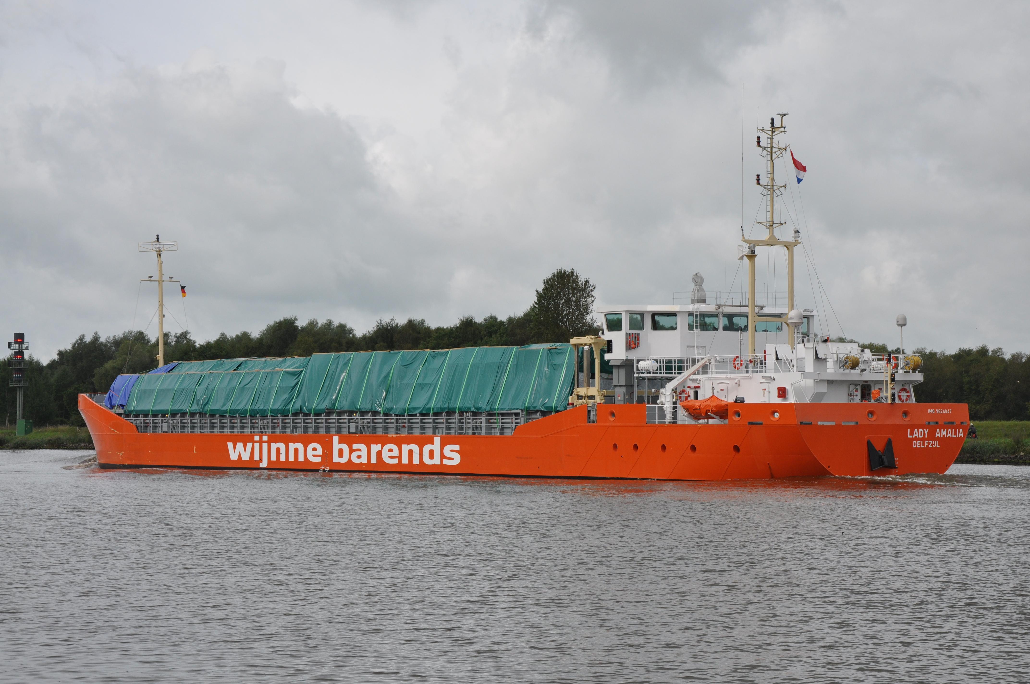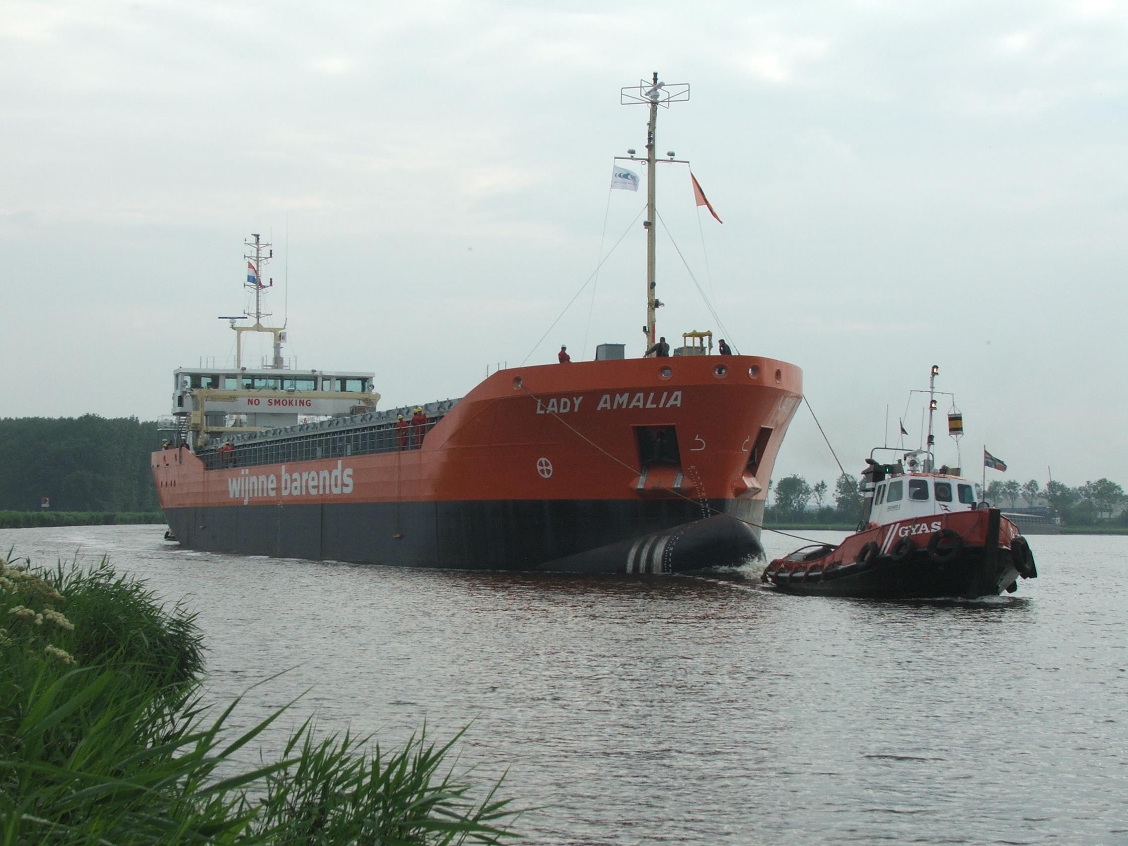 Lady Amalia 2012 (op stapel als "Prinses Amalia" ) tijdens haar transport van de nieuwbouwwerf naar Delfzijl t. h. v. de Farmsumerhaven op 10- july 2012. |