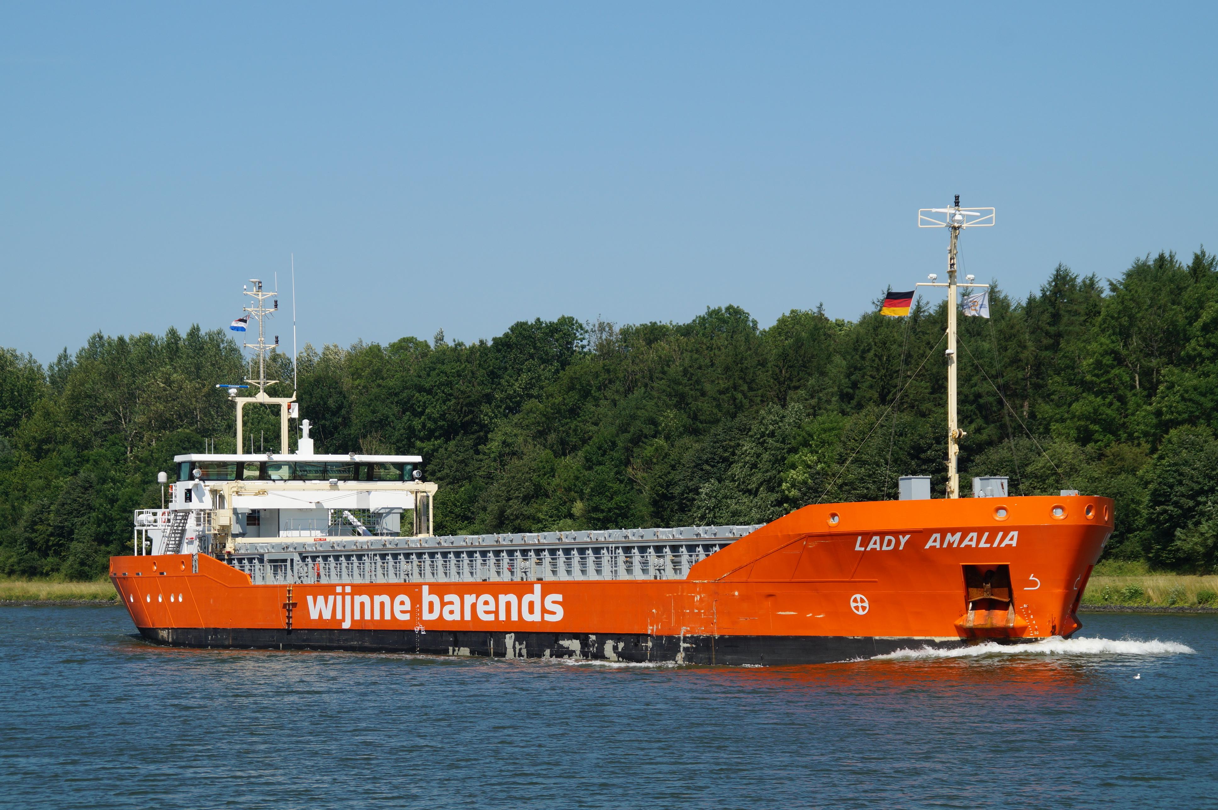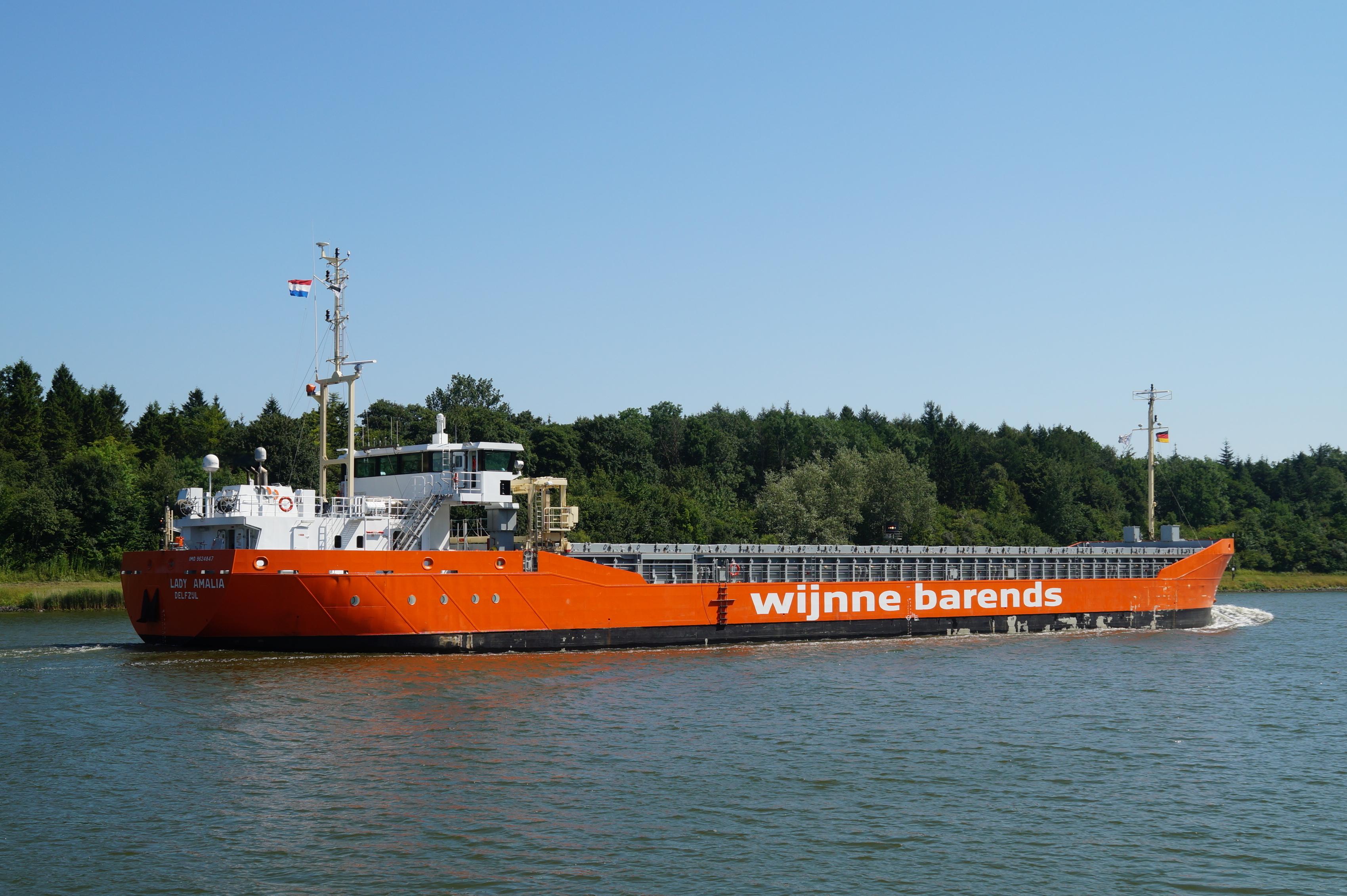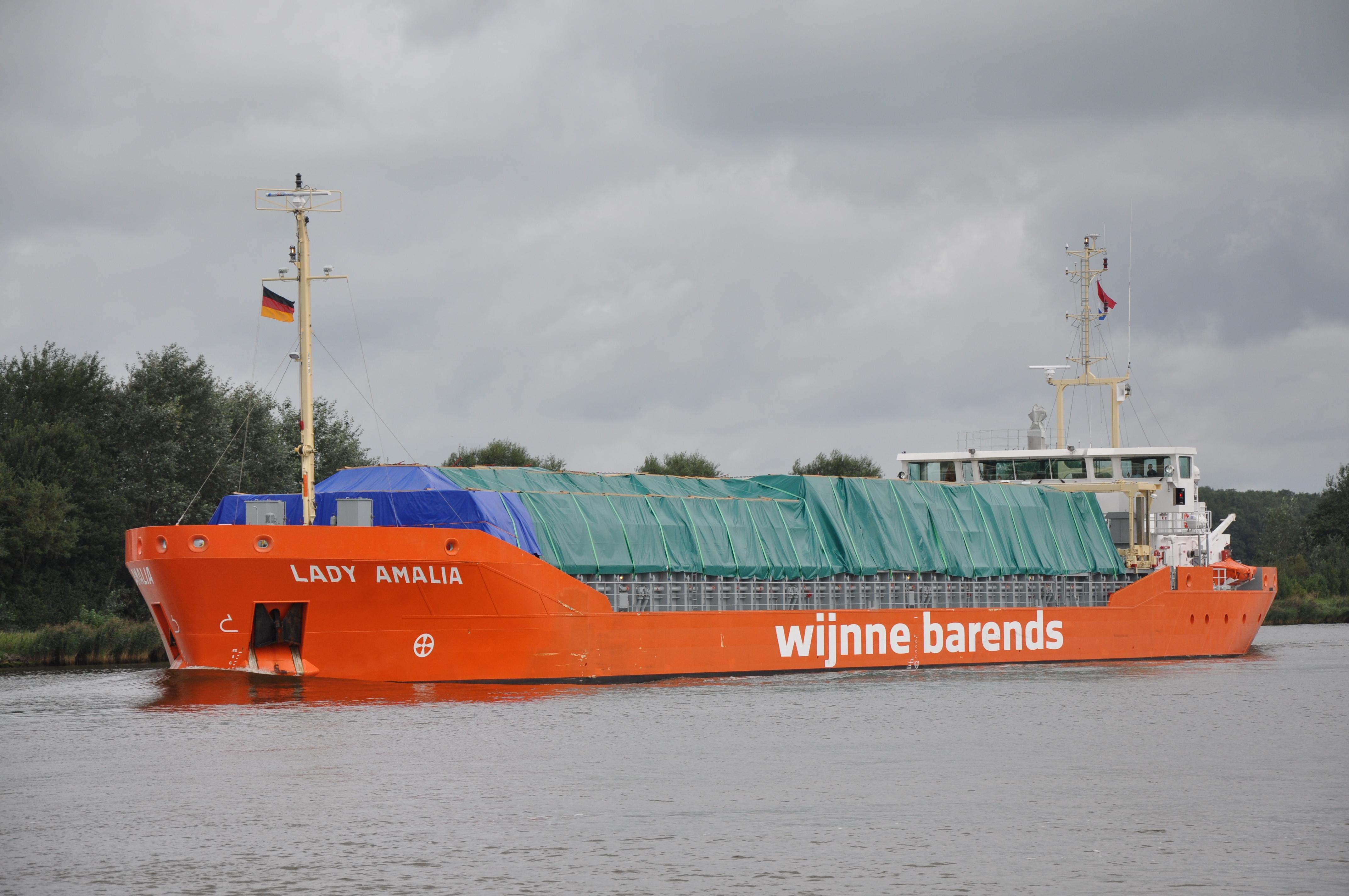 Lady Amalia 2012 (op stapel als "Prinses Amalia" ) tijdens haar transport van de nieuwbouwwerf naar Delfzijl t. h. v. de Farmsumerhaven op 10- july 2012. |