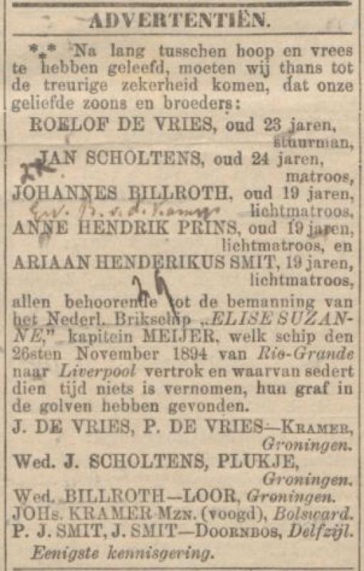 * 1892 t/m 1894 van de brik “Elisa Suzanna”, gebouwd in 1867 te Rotterdam, 268 ton o.m., varend voor K.B.Kuiper te Delfzijl;