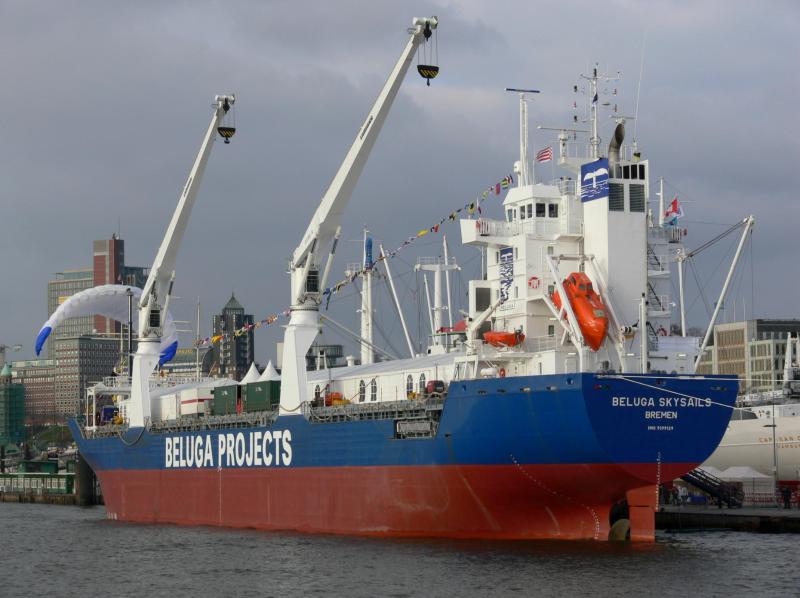 BELUGA SKYSAILS op 09-12-2007 bij het verlaten schepenlift Volharding Shipyards B.V., Harlingen. |