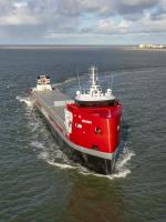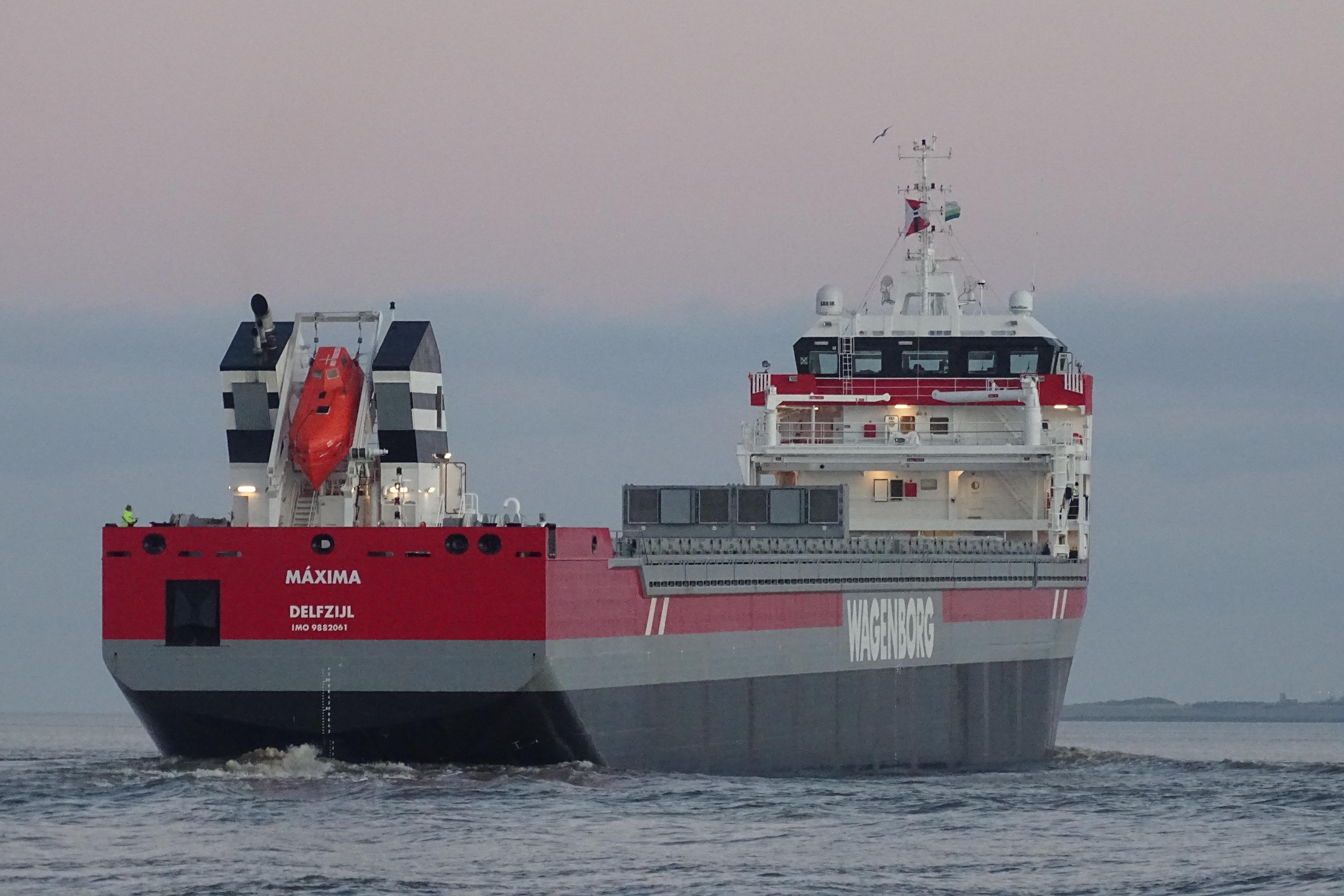 MÁXIMA vertrekt 26 januari 2021 uit Delfzijl voor haar 1e proefvaart op de Eems. |