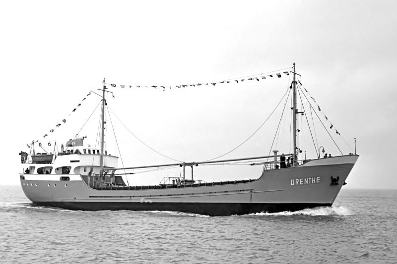 Friese koerier 02-02-1957: Drenthe: mooie aanwinst van rederij Holwerda. Proeftocht van moderne coaster op Eems (Van een onzer verslaggevers). Delfzijl — De Heerenveense kustvaartrederij Holwerda heeft er weer een coaster bij. Het is de Drenthe, een gloednieuw schip van 463 bruto registertonnen. Gistermiddag heeft de directeur van de werf Martin Jansen te Leer in Oost-Friesland het schip aan de reder overgedragen. Dat geschiedde tijdens een korte plechtigheid op het winderige en natte dek van het schip, enkele mijlen oostelijk van Delfzijl op de Eems, waar de Drenthe zijn officiële proefvaart voer.