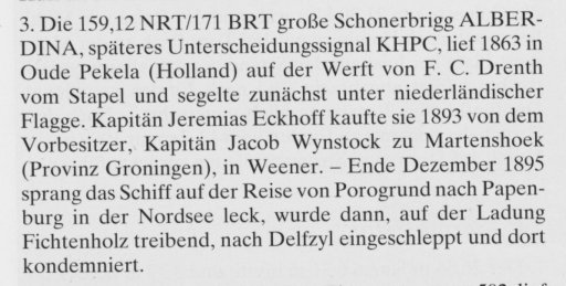 * 1893 van de 2/msch. “Alberdina” ex Elisabeth, ex Thecla Maria, gebouwd in 1863 te Pekela, 157 ton o.m., varend als kapitein/eigenaar vanuit Martenshoek. Het schip werd in 1893 verkocht naar Duitsland;