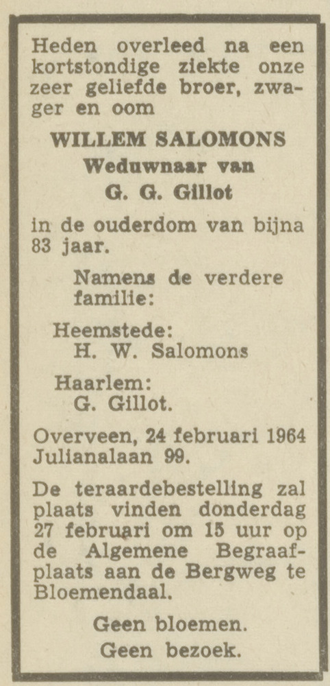 Willem overleed op 24.02.1964 te Overveen (82). (Overlijdensbericht in Haarlem’s Dagblad van 25-02-1964)