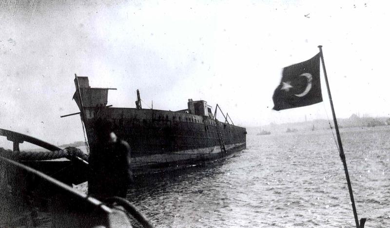 Het wrak nadert de haven van Istanbul, waar het opgelegd werd. Vaag in de verte (rechts van de vlaggemast) zijn nog de minarets van de Aghia Sophia, de tot moskee verbouwde kerk, zichtbaar. |