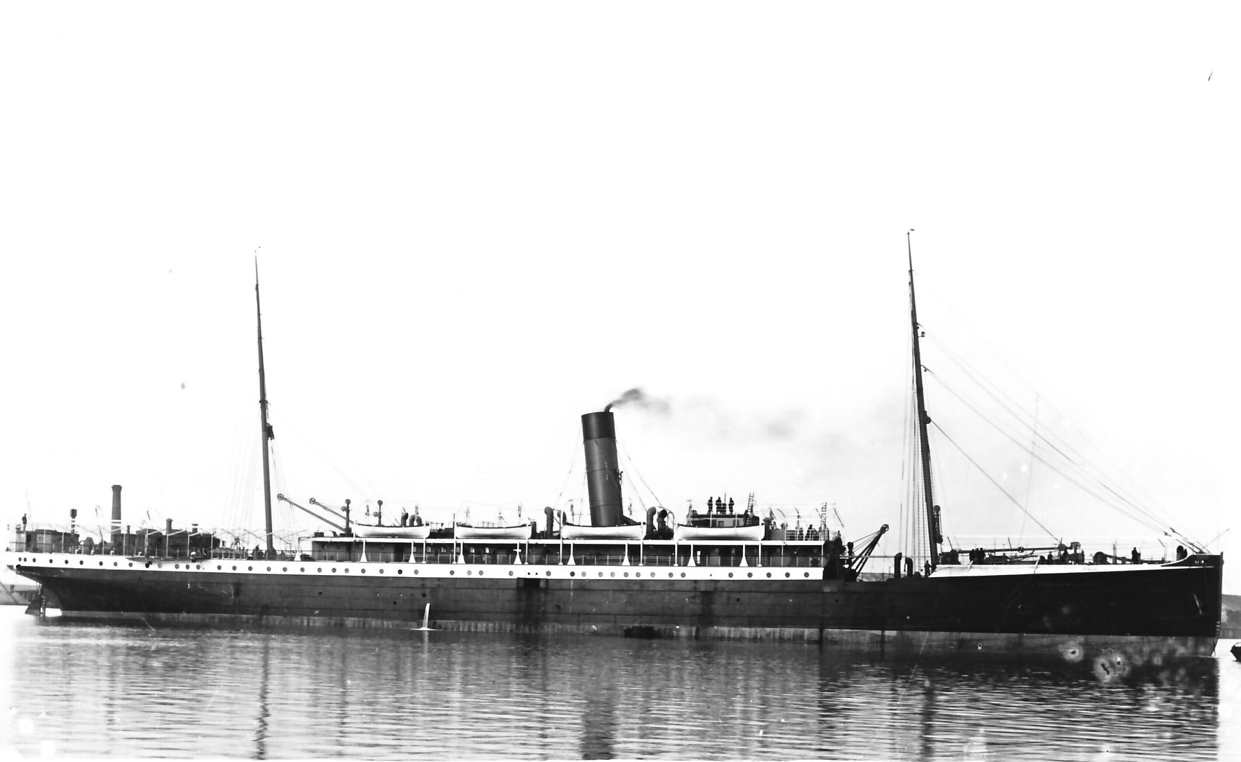 Detailopname van de ATENA, liggend te Odessa in 1918. Het Rodekruisteken (hospitaalschip) is nog duidelijk in de schoorsteen zichtbaar. |