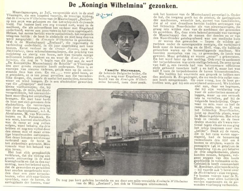 Op reis met 49 passagiers en post van Vlissingen naar Gravesend, is de ‘KONINGIN WILHELMINA’ op 31 juli 1916 om 09.50 uur des morgens op 2 mijl van het lichtschip ‘NOORD-HINDER’ op een Duitse mijn gelopen. Een hevige ontploffing vond plaats, vermoedelijk onder het voorketelruim. De boten werden gevierd en allen gingen van boord, doch bij gehouden appèl bleken vijf personen vermist, waaronder 4 man, die in het voorketelruim dienst hadden; dit ruim stond intussen vol water en deze 4 personen waren waarschijnlijk al bij de ontploffing omgekomen. De ‘KONINGIN WILHELMINA’ bleef nog een tijd drijven, zodat ook nog post van de 151 zakken mail kon worden geborgen, maar om 10.35 uur des morgens van 31 juli 1916 brak het schip in tweeën en zonk in de diepte. De boten begaven zich naar het lichtschip ‘NOORD-HINDER’ en werden later naar Vlissingen gebracht, waar de volgende dag nog 2 personen aan hun verwondingen overleden. (Naast de 49 passagiers had de ‘KONINGIN WILHELMINA’ nog een bemanning van 52 personen aan boord gehad.). Werd aanvankelijk gemeend, dat het schip op een op 18 maart 1916 door de Duitse onderzeeboot ‘UC.1.’ gelegde mijn was gelopen, later onderzoek wees uit dat het meer waarschijnlijk een mijn, gelegd door de Duitse torpedoboot ‘B.111’, was. |