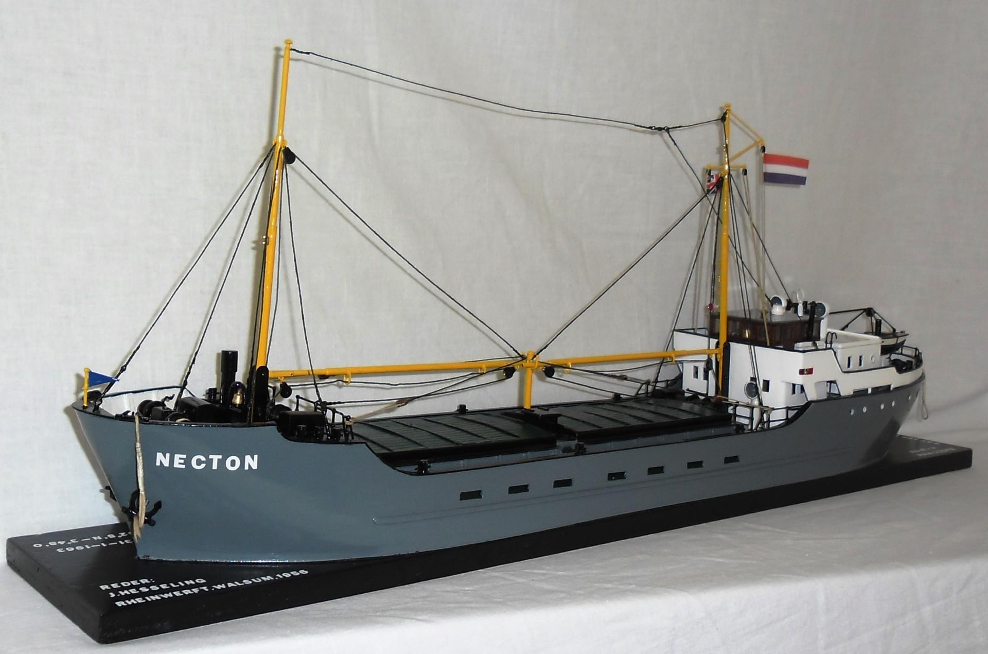 Final Fate: De coaster ms. 'NECTON' (1956) van J. Hesseling uit Groningen onder kapitein W.F.K. Korver, komende uit Norwich naar Rotterdam met een lading van 376 ton gerst in bulk en zakken, raakte halverwege Norwich en Great Yarmouth op de rivier als gevolg van zware ijsgang vast in het ijs. Op 29 januari, na gedurende een week in het ijs vast te hebben gezeten, kan het schip weer loskomen en daarna Great Yarmouth bereiken. Na vertrek vanuit Great Yarmouth op 31 januari met bestemming Rotterdam wordt slagzij over stuurboord geconstateerd en neemt de slagzij zodanig toe, dat de bemanning het schip moet verlaten. Met uitzondering van de kapitein, die aan boord blijft worden de overige bemanningsleden korte tijd later opgepikt door de Engelse coaster 'Lady Sonia'. Langzaam doorvarende richting Hoek van Holland besluit Kover in het zicht van de haven ook van boord te gaan, waarbij hij wordt opgepikt door de vlet van de loodsboot. Pogingen van de reeds te hulp geschoten sleepboot 'Gele Zee' van L. Smit en Co's Internationale Sleepdienst om het schip binnen te brengen mislukken. De 'NECTON' zinkt op 12 mijl afstand ten westen van Hoek van Holland in positie: 52.05 N - 03.48 O.