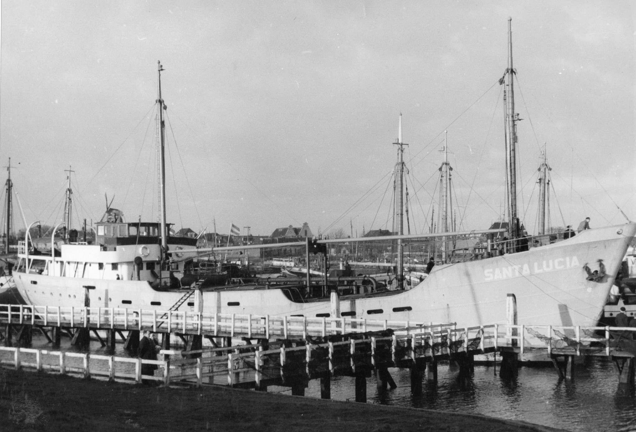 NvhN 05-12-1964: Groninger kustvaarder SANTA LUCIA gezonken. Opvarenden behouden te Delfzijl aan wal. (Van onze redactie te Delfzijl) „We hadden slagzij, die steeds erger werd. Op het laatst lagen we zo scheef, dat we geen olie meer konden smeren. De motor, die al een paar keer had geweigerd, viel uit en toen wist ik dat het schip verloren was. We gooiden een opblaasbaar vlot overboord en zijn er in gesprongen. Het vlot was nog niet eens zo ver weg toen het schip zonk. Een half uur later werden we door de Nederlandse loodsboot Castor opgepikt". In sobere bewoordingen vertelde kapitein L. H. Siertsema (38) uit Groningen (een zoon van de Groninger advocaat mr. J. Siertsema) ons wat er vannacht omstreeks één uur in de Eemsmonding nabij Borkum met de Groninger kustvaarder Santa Lucia en zijn bemanning is gebeurd. Scheepskat verdronken. We spraken met hem aan boord van de loodsenafhaler Eems, die de opvarenden van de loodsboot naar Delfzijl bracht. Het relaas van kapitein Siertsema was enerzijds triest om het verlies van schip, lading en persoonlijke bezittingen, anderzijds opgewekt om het behoud van het leven van acht bemanningsleden. Alleen de scheepspoes Miekie, die door haar Poolse afkomst „de communist" werd genoemd, is tot spijt van alle opvarenden in de golven verdwenen. Kapitein Siertsema, die precies een jaar op dit schip voer („Het vorige jaar ben je in de nacht van 4 op 5 december om half twee aan boord gegaan. Dat was in het Kielerkanaal', wist zijn vrouw, die zich naar Delfzijl begeven had, zich te herinneren), vertelde dat het 520 ton d.w. metende schip vierentwintig uur voor de ramp moeilijkheden kreeg. Er sloeg een grondzee over, die enkele deuren aan bakboordzij de wegsloeg. Waarschijnlijk is de uit kolen bestaande lading toen gaan schuiven, wat de slagzij veroorzaakte. „We wilden eigenlijk verder varen, maar de motor weigerde een paar keer en de schroefas liep warm, zodat we besloten onze reis van Goole naar Kopenhagen te onderbreken en de Eems op te varen", aldus kapitein Siertsema, die, naar men ons vertelde, onder alle omstandigheden doodkalm blijft. Grond zeeën. In de Eemsmonding kreeg de Santa Lucia met grondzeeën te maken, die het schip méér slagzij deed maken. Kapitein Siertsema realiseerde zich, toen de motor uitviel, maar al te goed dat de kustvaarder reddeloos verloren was. Hij gaf zijn bemanning, die hij ongeveer een kwartier tevoren had laten wekken, de opdracht van boord te gaan. Er was op dat ogenblik haast geboden. By het overspringen op het vlot raakte de kapitein nog even in het koude, hoog opgezweepte water. Hij ging tussen het schip en het vlot een paar maal kopjeonder. „0e stuurman en de meester hebben me er, geloof ik, uitgetrokken", zei hij. Op de vraag van een opvarende of hij de lijn nog vast had, antwoordde hij bevestigend. Lof voor vlot. Veel lof had de kapitein voor het vlot. Hij vertelde ons hoe het tegen de romp van de loodsboot Castor werd geslagen en alle klappen uitstekend opving. „Zet u ook maar in de krant dat het zo fijn is dat de loodsboten radio-telefonie hebben, anders waren we niet gevonden", zei ons stuurman J. van de Veen (23) uit Appingedam. Ze vertelden, dat alleen de loodsboten voor de Eems deze voorziening hebben. De loodsboot was de Santa Lucia al tegemoet gekomen. Op dat moment was er windkracht acht, in buien zelfs uitlopend tot tien. De bemanning hééft bij het aan boord gaan van de Castor nog wel enkele moeilijke ogenblikken gehad, maar tenslotte kregen de mannen van de loodsboot toch de gelegenheid om de natte geredden te verzorgen. En ze kweten zich uitstekend van hun taak, naar ons werd verzekerd. Eerste reis van kok. Voor de kok, de 27-jarige M. C. M. Buist uit Tilburg was alles nog iets ongewoner dan voor de anderen. Hij was pas sedert 27 november aan boord en het was zijn eerste reis. „Ach, ik dacht ik moet me maar kalm houden. Er moet geen paniek komen" vertelde hij terwijl hij met een hand langs zijn stoppelbaard streek. „Weer varen? Ja, waarom niet!?" Een geluk vond men het dat in Goole de vrouw van machinist G. A. Heringa uit Leeuwarden van boord was gegaan. De machinist is juist gisteren 41 jaar geworden. Twee Spaanse opvarenden zouden in het Kielerkanaal van boord stappen om naar huis te gaan. Aan boord van de Santa Lucia, die eigendom van de gelijknamige rederij te Groningen is, voeren voorts nog de 18-jarige tweede machinist G. Postma uit Valkenburg en de 21-jarige matroos J. J. D. Schram uit Vlissingen.
