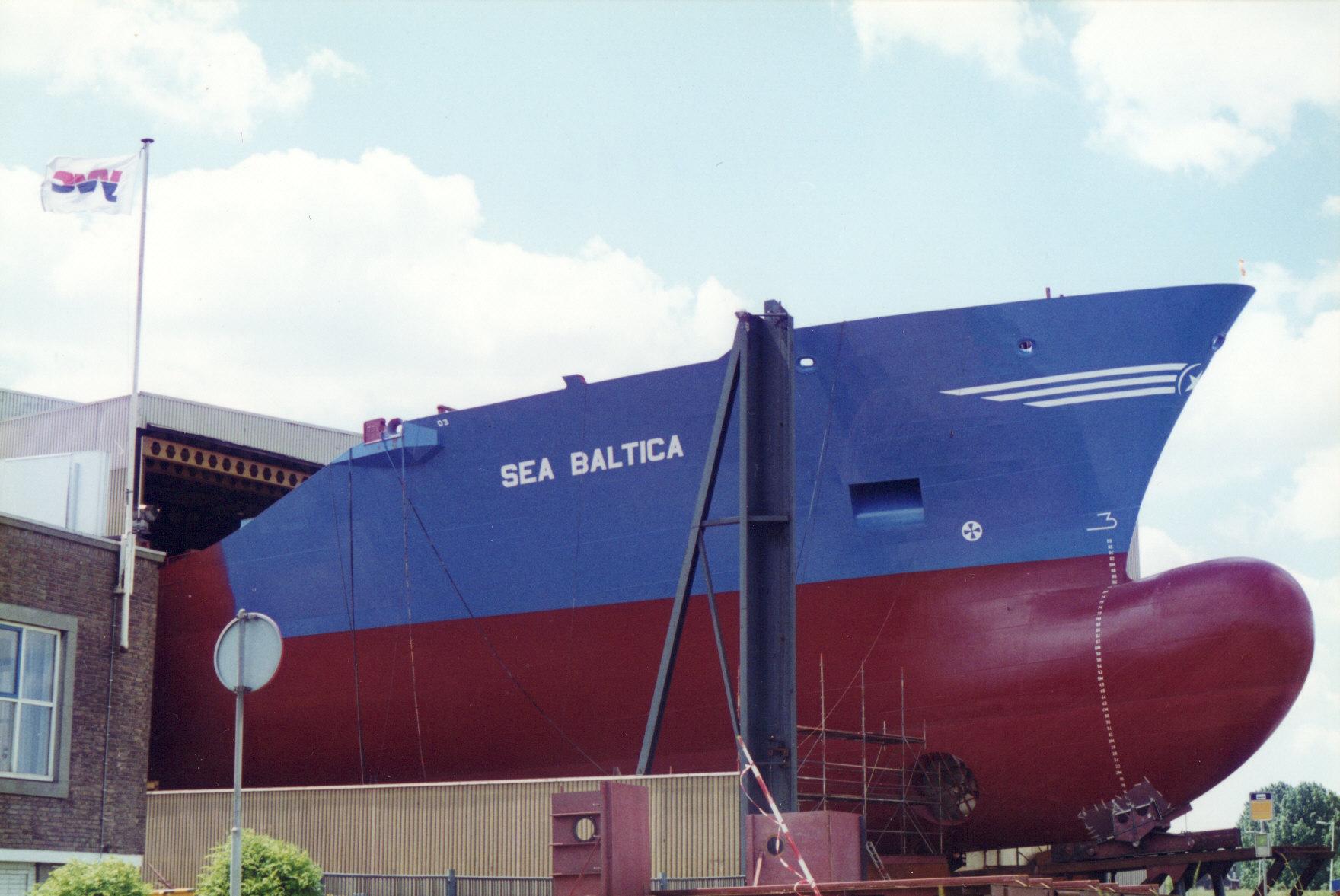 SEA BALTICA op de bouwwerf, onder de bulksteven ligt een sectie van het achterschip |