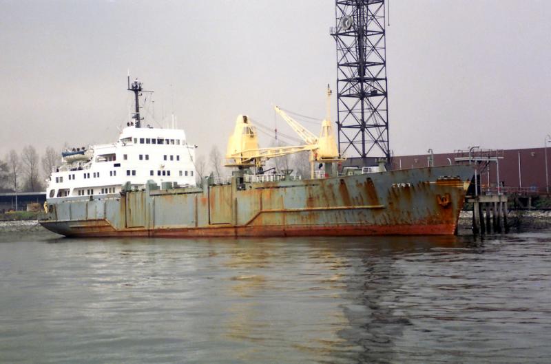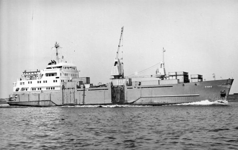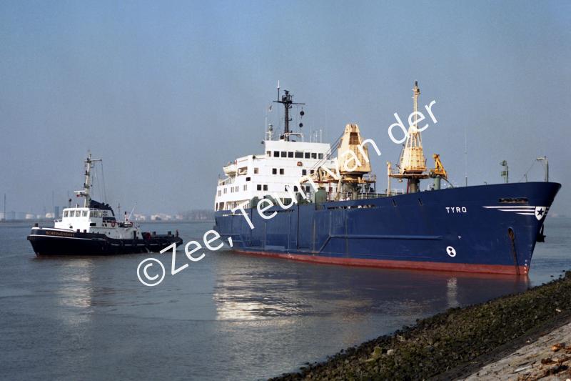 Tyro 1967, 11 maart 1987 omhoog bij MMS op de Nieuwe Waterweg. Sleepboot SCHOUWENBANK assisteert. |