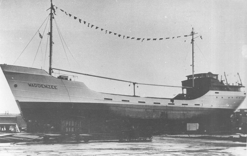 NvhN 26-01-1959: Veertigste stapelloop van kustvaarder. Zaterdagmorgen had op de scheepswerf Harlingen de stapelloop plaats van de 730 ton d.w. metende kustvaarder „WADDENZEE" die wordt gebouwd voor rekening van rederij Holwerda te Heerenveen. In de na-oorlogse periode betekende het de 40ste stapelloop van een in Friesland gebouwde kustvaarder.