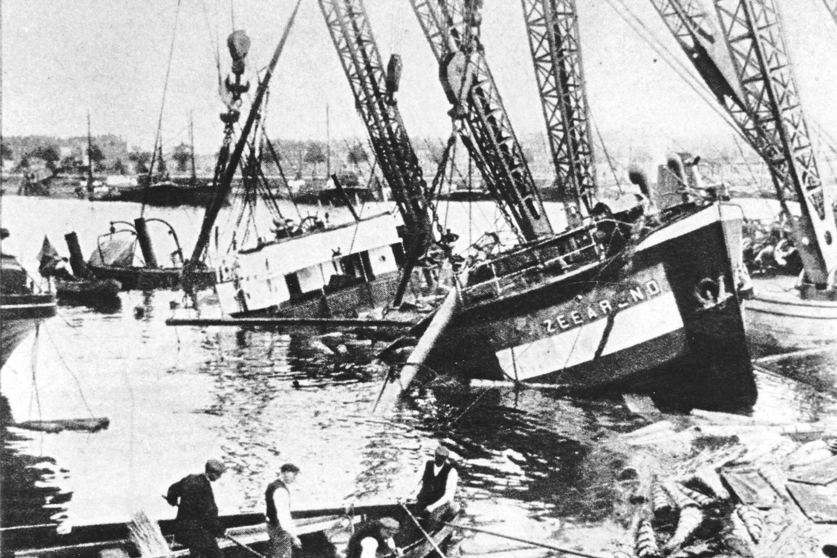 Raad voor de Scheepvaart. Vervolgens heeft de Raad een onderzoek ingesteld betreffende het omslaan van het motorschip ZEEAREND, tijdens lading op 9 oktober jl. in de Maashaven te Rotterdam. De gezagvoerder J. Zwierts verklaarde, dat het schip, dat 212 ton netto meet, met 300 ton papier en vis werd geladen voor Londen. Getuige hield geen toezicht op de lading en gaf geen aanwijzing over de wijze van stuwen. Ook een ander had geen toezicht gehouden bij de lading In het ruim, wel bij de deklast. Op het dek werden 20 ton vis gezet.
