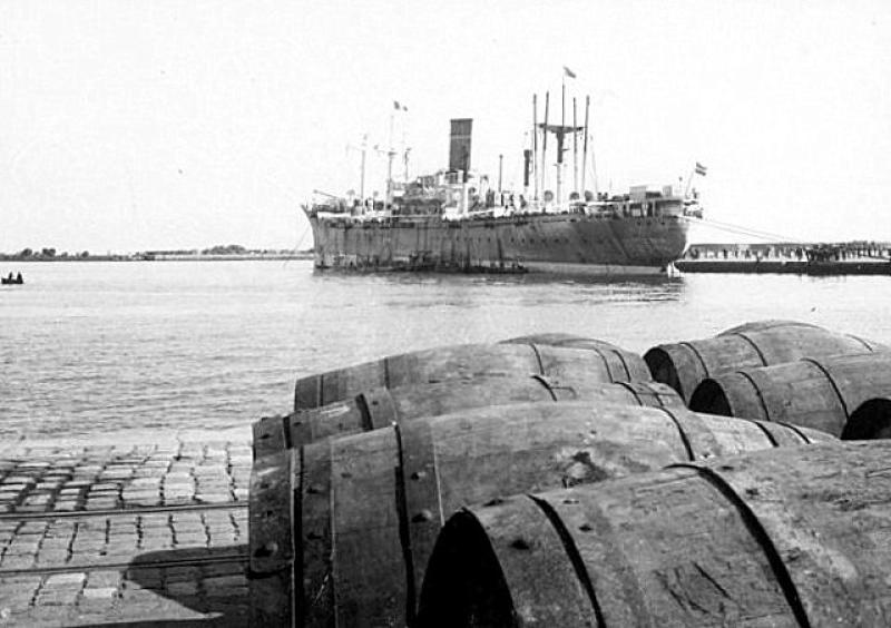 De ZUIDERKRUIS net aangekomen aan de Lloydkade, met de schoorsteenkleuren van de Rotterdamsche Lloyd. |