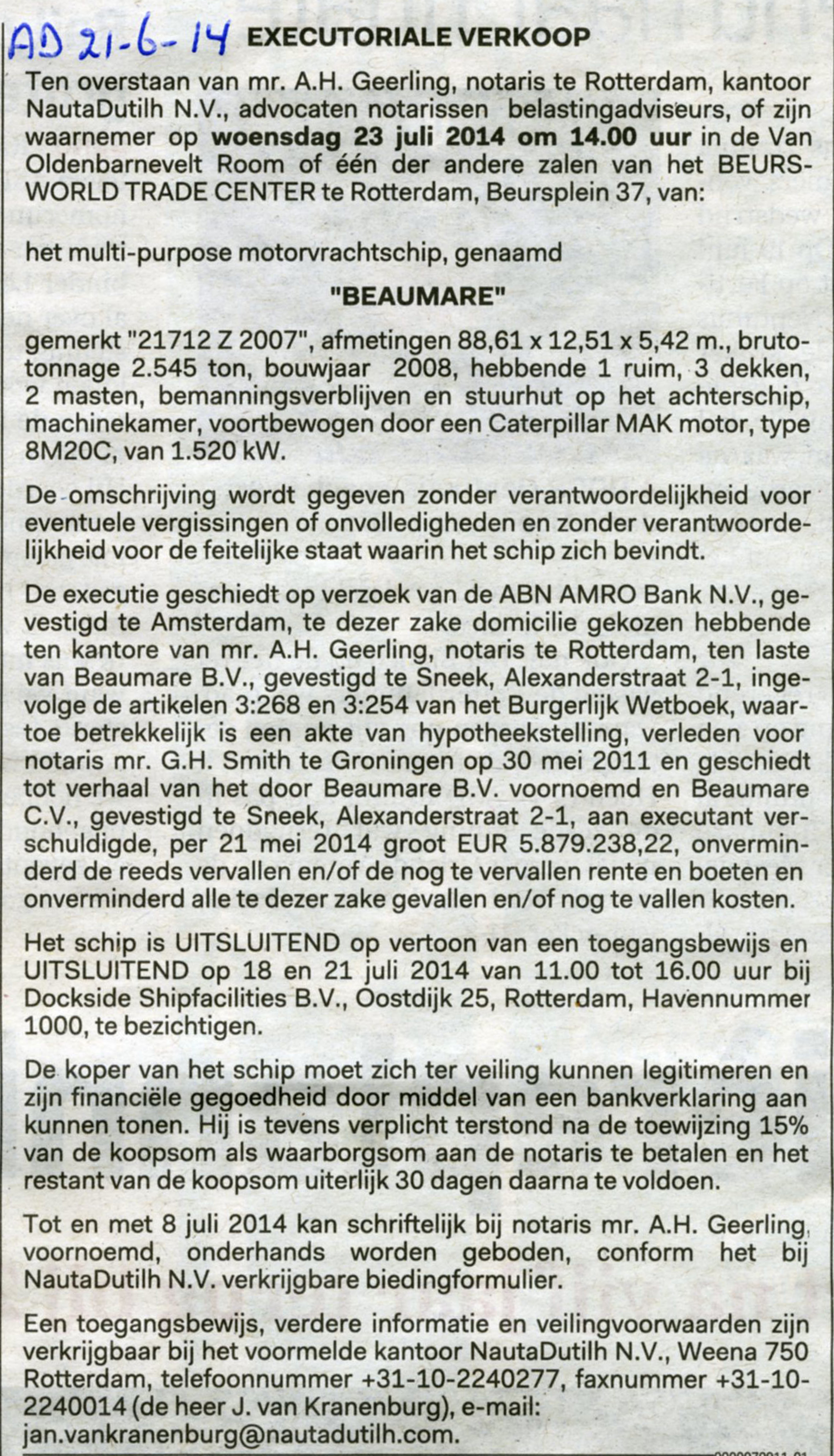 BEAUMARE op 25-06-2014 op de Nieuwe Waterweg. |