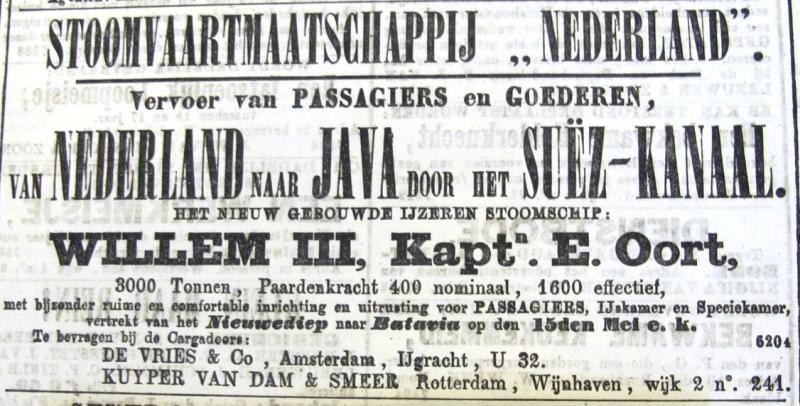 Het ss “Willem III” werd in 1871 gebouwd bij John Elder & Co te Glasgow, mat 2735 Brt en voer voor de Stoomv. Mij “Nederland” te Amsterdam 072.