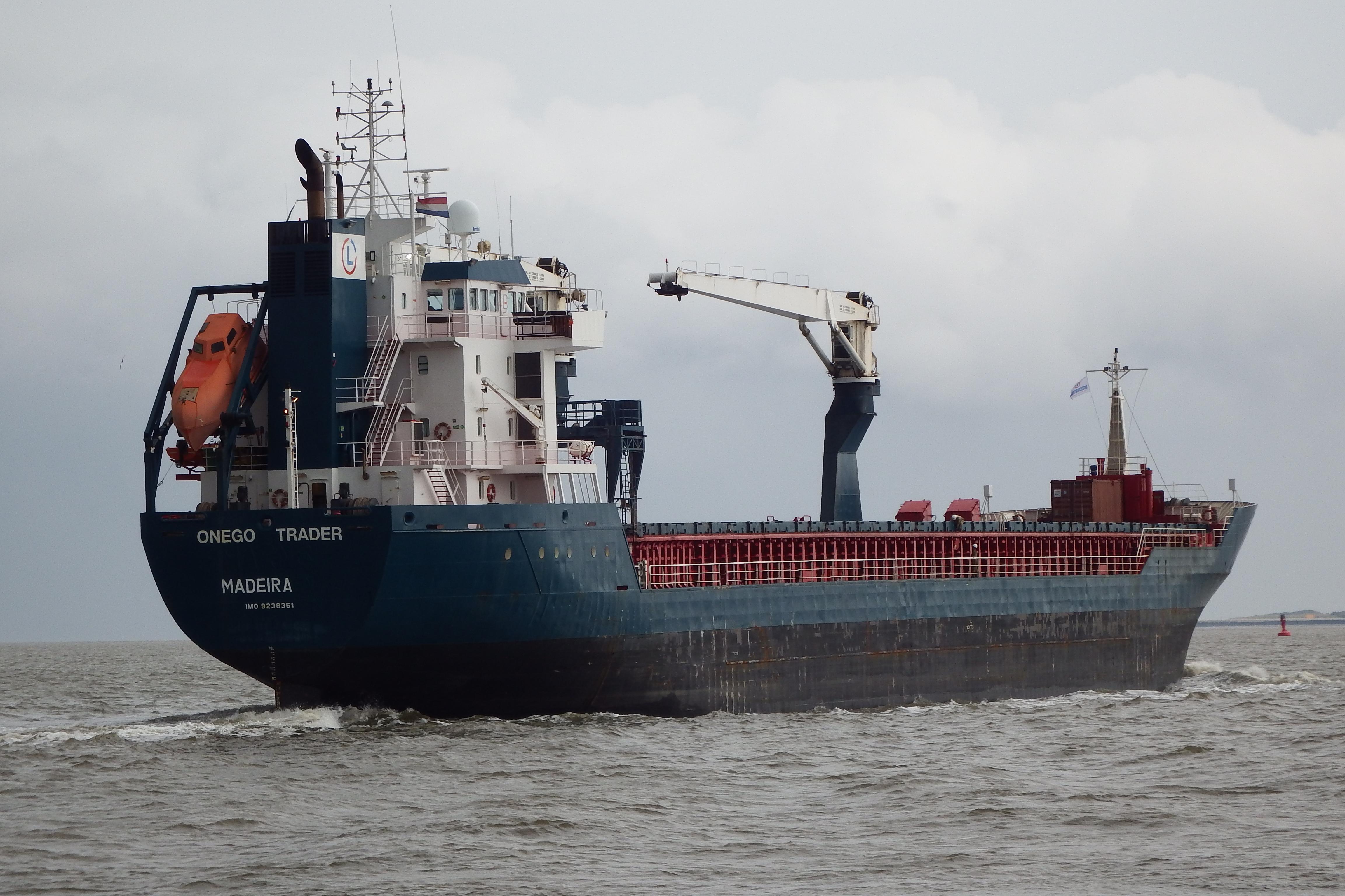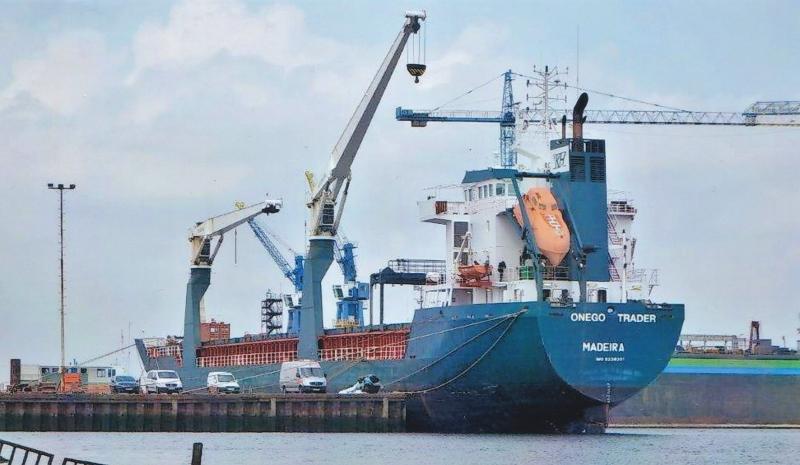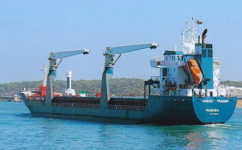 ONEGO TRADER verlaat Delfzijl onder de Portugeese vlag ( Madeira) op 09-08-2018. |