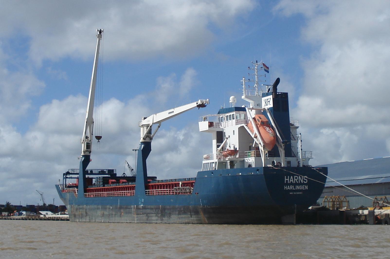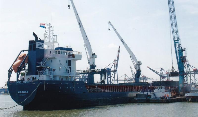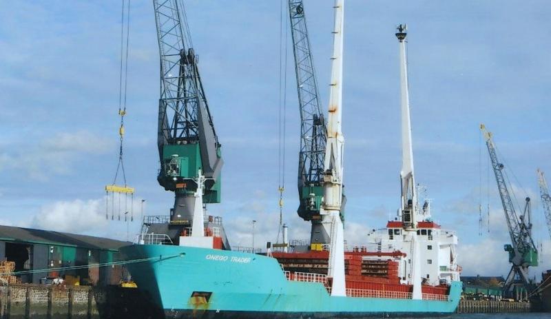 ONEGO TRADER op 03-06-2016 te Delfzijl afgemeerd aan de Wagenborg Terminal zonder de 2 verwijderde dek kranen, die op de kade staan. |