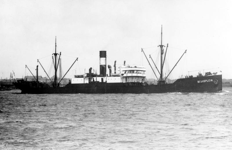 Stranding van het vrachtschip ss. BEURSPLEIN (1920) van de Stoomvaart Maatschappij 'Millingen' te Rotterdam, op weg van Rotterdam naar Narvik en varende in ballast, bij Holvik, tijdens een zware sneeuwbui. Na het uitpompen van de ballast uit tanks 1 & 2 kan het vrachtschip met eigen middelen weer vlot worden gebracht. |